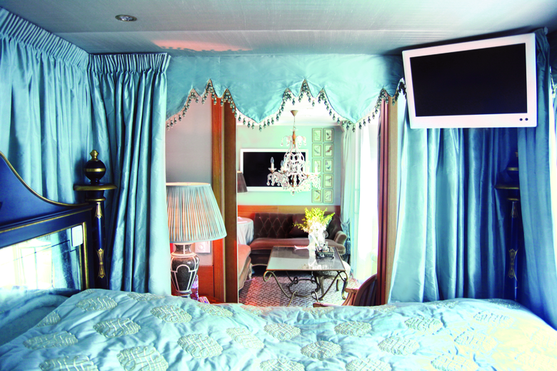 Luxurious riverview stateroom (163 sq ft - 15.1 sq m).Handcrafted Savoir® Beds of England, built-in closet, hair dryer, safe, flat-screen TV with infotainment center and satellite, individual thermostat and bottled water.Marble bathroom with Asprey bath and body products, plush towels, towel warmer, waffle bathrobes and slippers.