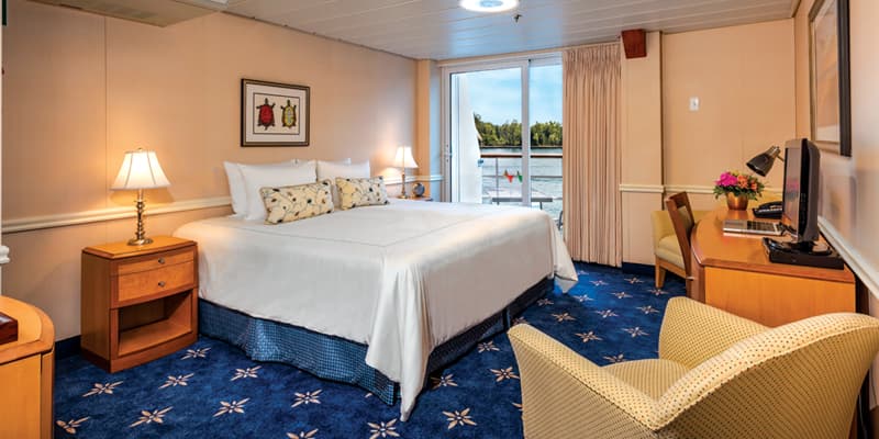 At 368 sq. ft., our AAM staterooms are designed to offer the privacy you desire while cruising. Located on the fourth deck, these spacious staterooms are elegantly furnished and feature floor to ceiling sliding glass doors that lead to a private walk-out balcony where the grandness of the Pacific Northwest scenery can be enjoyed.